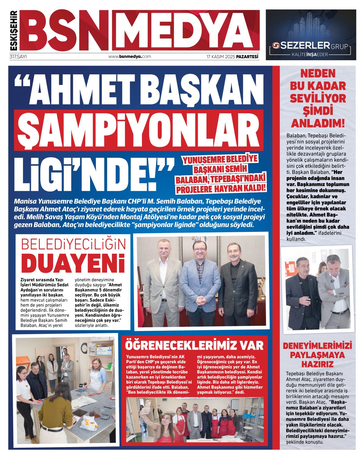 Ziyaret sırasında Yazı İşleri Müdürümüz Sedat Aydoğan’ın sorularını yanıtlayan iki başkan, hem mevcut çalışmaları hem de yeni projeleri değerlendirdi. İlk dönemini yaşayan Yunusemre Belediye Başkanı Semih Balaban, Ataç’ın yerel yönetim deneyimine duyduğu saygıyı “Ahmet Başkanımız 5 dönemdir seçiliyor. Bu çok büyük başarı. Sadece Eskişehir’in değil, ülkemiz belediyeciliğinin de duayeni. Kendisinden öğreneceğimiz çok şey var.” sözleriyle anlattı.