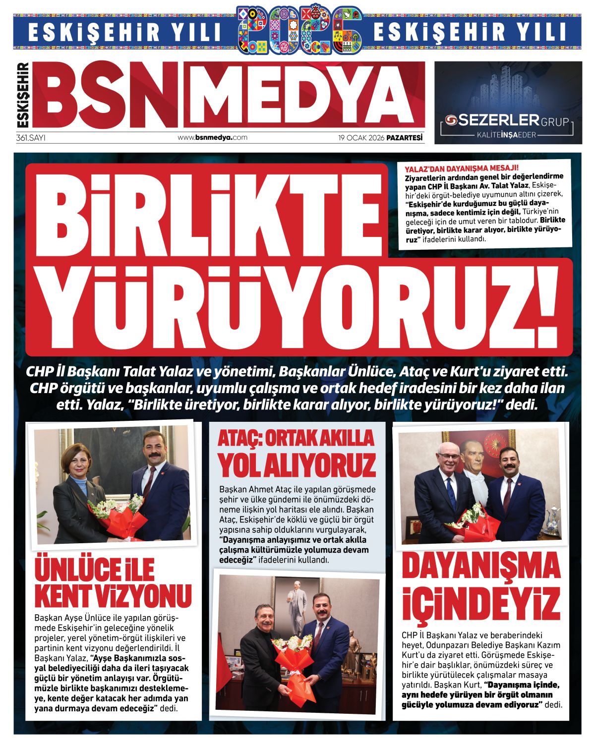 CHP İl Başkanı Talat Yalaz ve yönetimi, Başkanlar Ünlüce, Ataç ve Kurt’u ziyaret etti. CHP örgütü ve başkanlar, uyumlu çalışma ve ortak hedef iradesini bir kez daha ilan etti. Yalaz, “Birlikte üretiyor, birlikte karar alıyor, birlikte yürüyoruz!” dedi.