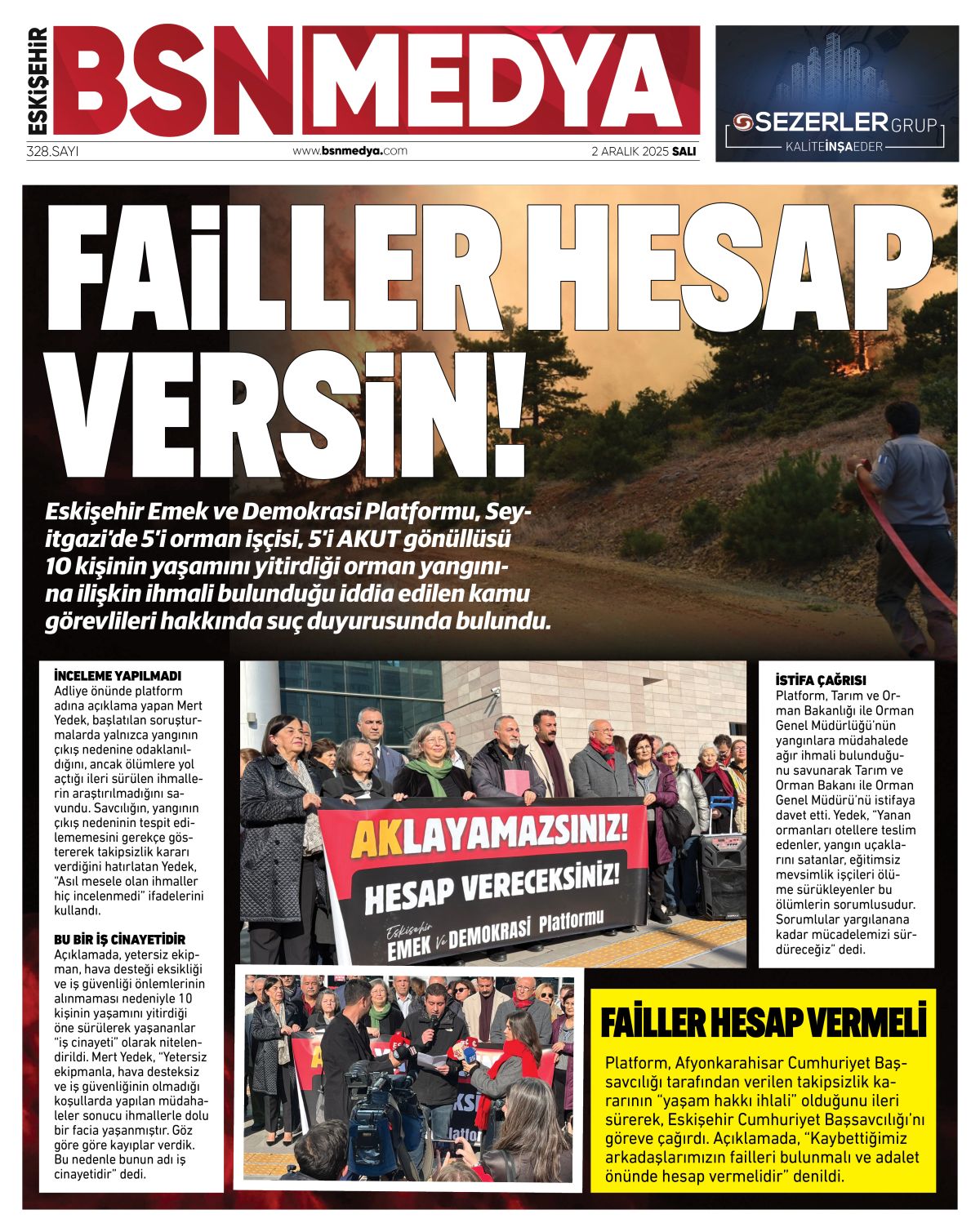 Eskişehir Emek ve Demokrasi Platformu, Seyitgazi’de 5’i orman işçisi, 5’i AKUT gönüllüsü 10 kişinin yaşamını yitirdiği orman yangınına ilişkin ihmali bulunduğu iddia edilen kamu görevlileri hakkında suç duyurusunda bulundu.