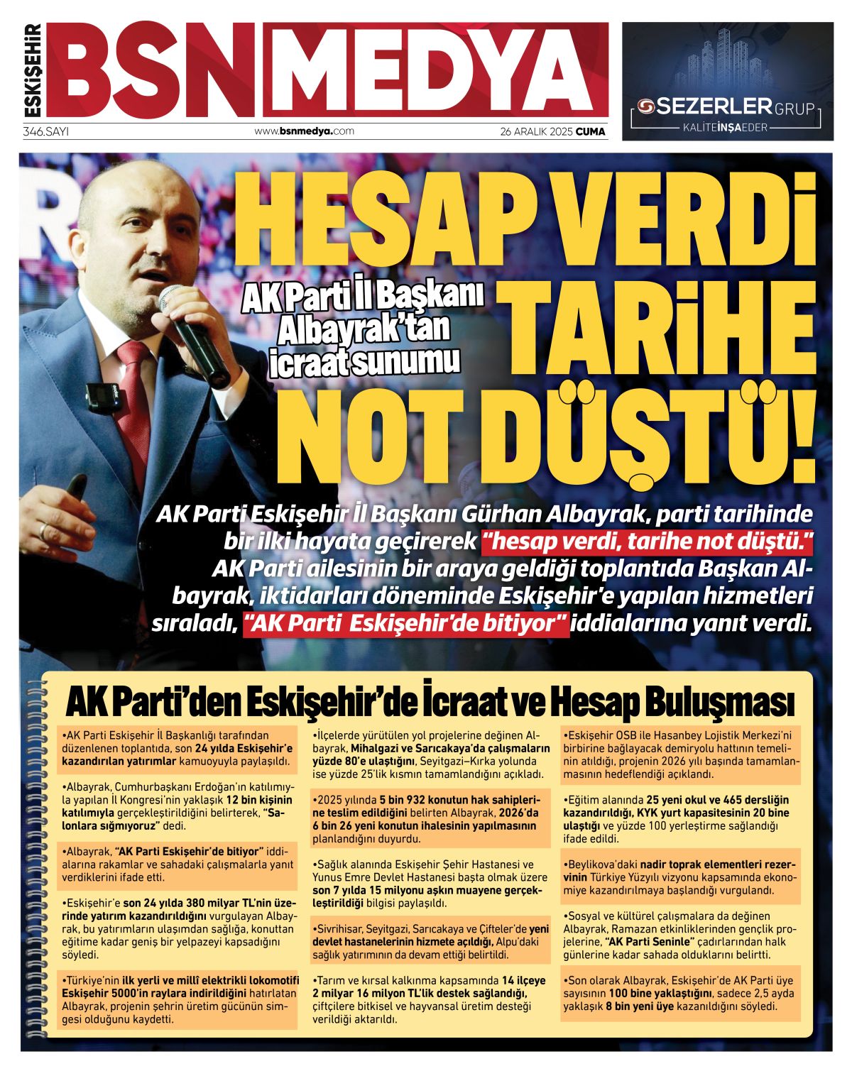 AK Parti Eskişehir İl Başkanı Gürhan Albayrak, parti tarihinde bir ilki hayata geçirerek “hesap verdi, tarihe not düştü.” AK Parti ailesinin bir araya geldiği toplantıda Başkan Albayrak, iktidarları döneminde Eskişehir’e yapılan hizmetleri sıraladı, “AK Parti Eskişehir’de bitiyor” iddialarına yanıt verdi.