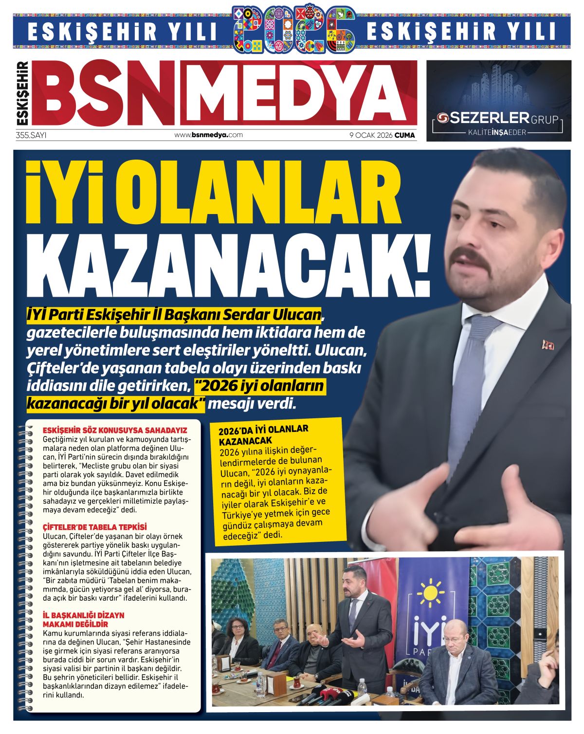 İYİ Parti Eskişehir İl Başkanı Serdar Ulucan, gazetecilerle buluşmasında hem iktidara hem de yerel yönetimlere sert eleştiriler yöneltti. Ulucan, Çifteler’de yaşanan tabela olayı üzerinden baskı iddiasını dile getirirken, “2026 iyi olanların kazanacağı bir yıl olacak” mesajı verdi.