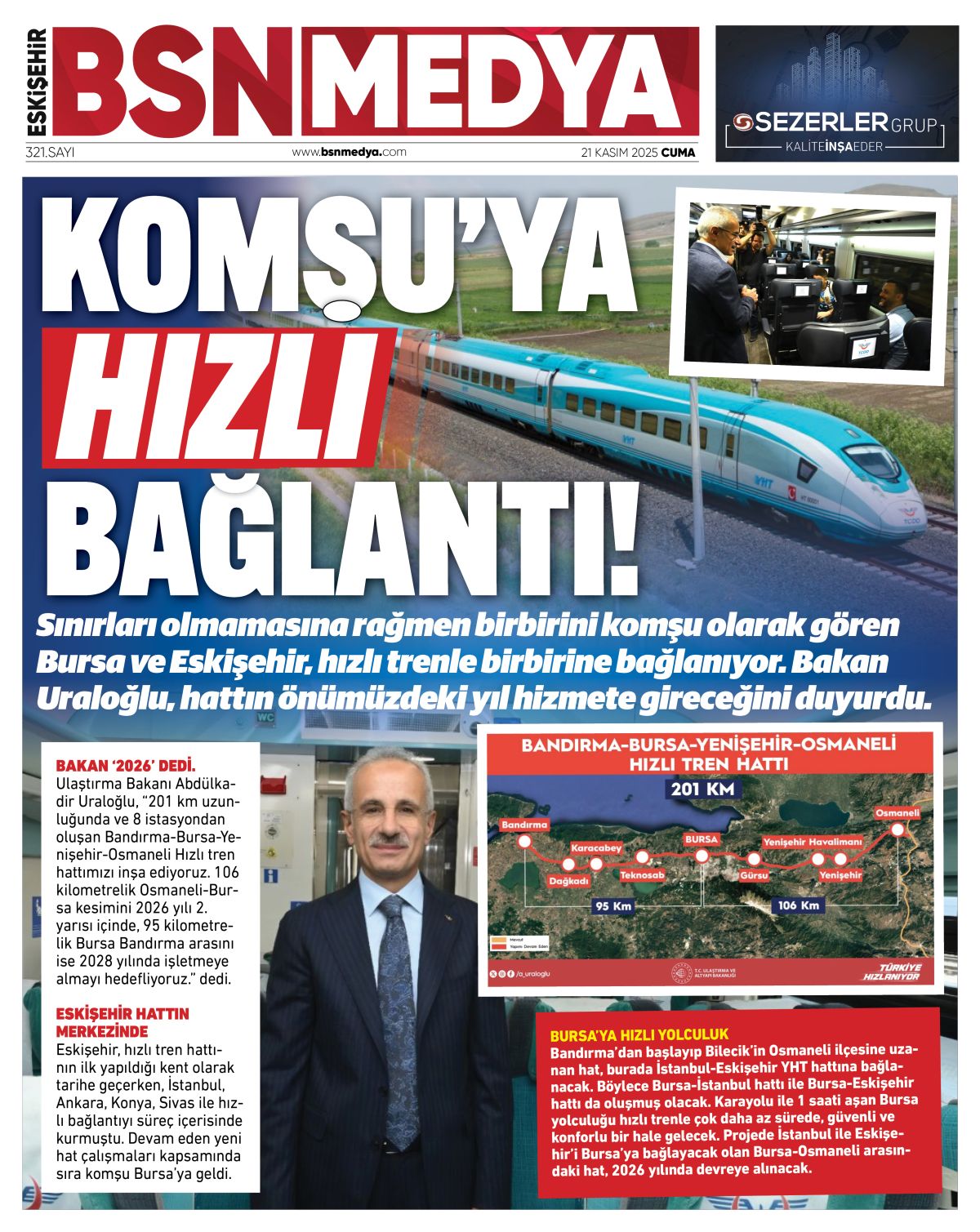 Sınırları olmamasına rağmen birbirini komşu olarak gören Bursa ve Eskişehir, hızlı trenle birbirine bağlanıyor. Bakan Uraloğlu, hattın önümüzdeki yıl hizmete gireceğini duyurdu.