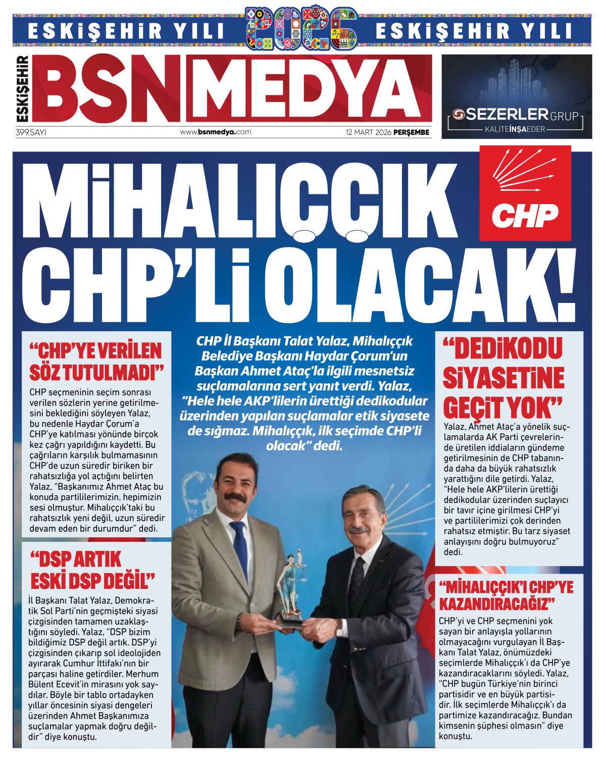CHP İl Başkanı Talat Yalaz, Mihalıççık Belediye Başkanı Haydar Çorum’un Başkan Ahmet Ataç’la ilgili mesnetsiz suçlamalarına sert yanıt verdi. Yalaz, “Hele hele AKP’lilerin ürettiği dedikodular üzerinden yapılan suçlamalar etik siyasete de sığmaz. Mihalıççık, ilk seçimde CHP’li olacak” dedi.