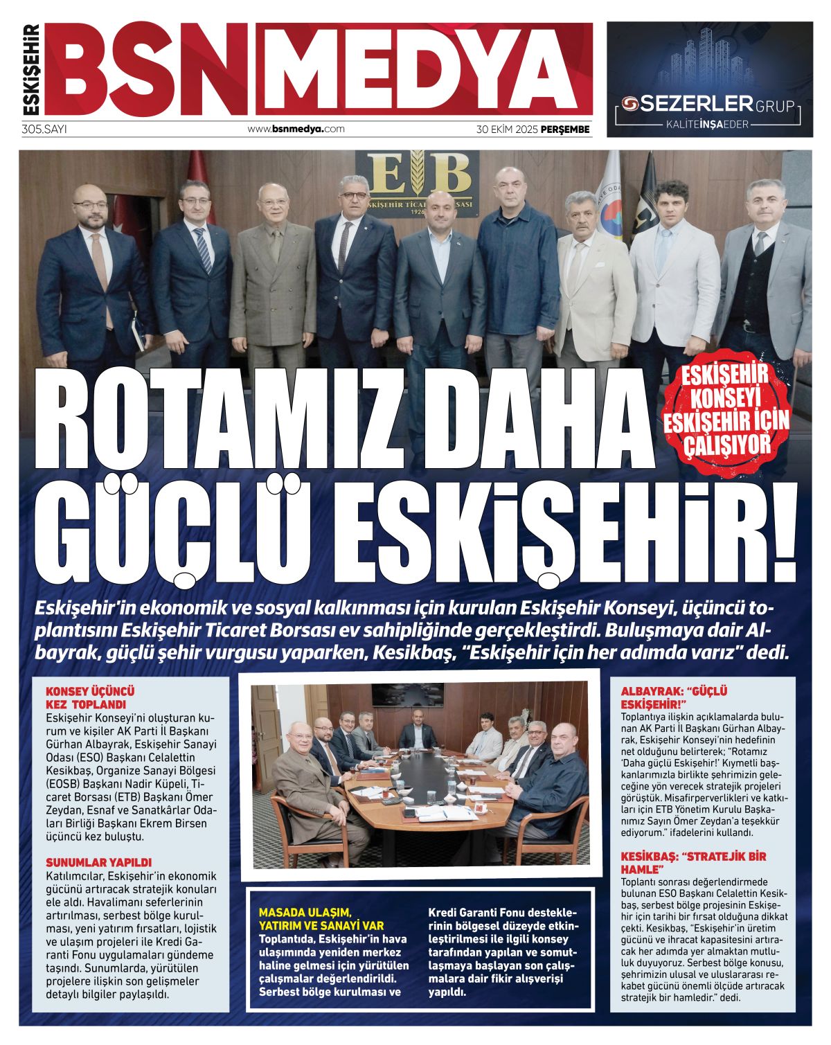 Eskişehir’in ekonomik ve sosyal kalkınması için kurulan Eskişehir Konseyi, üçüncü toplantısını Eskişehir Ticaret Borsası ev sahipliğinde gerçekleştirdi. Buluşmaya dair Albayrak, güçlü şehir vurgusu yaparken, Kesikbaş, “Eskişehir için her adımda varız” dedi.