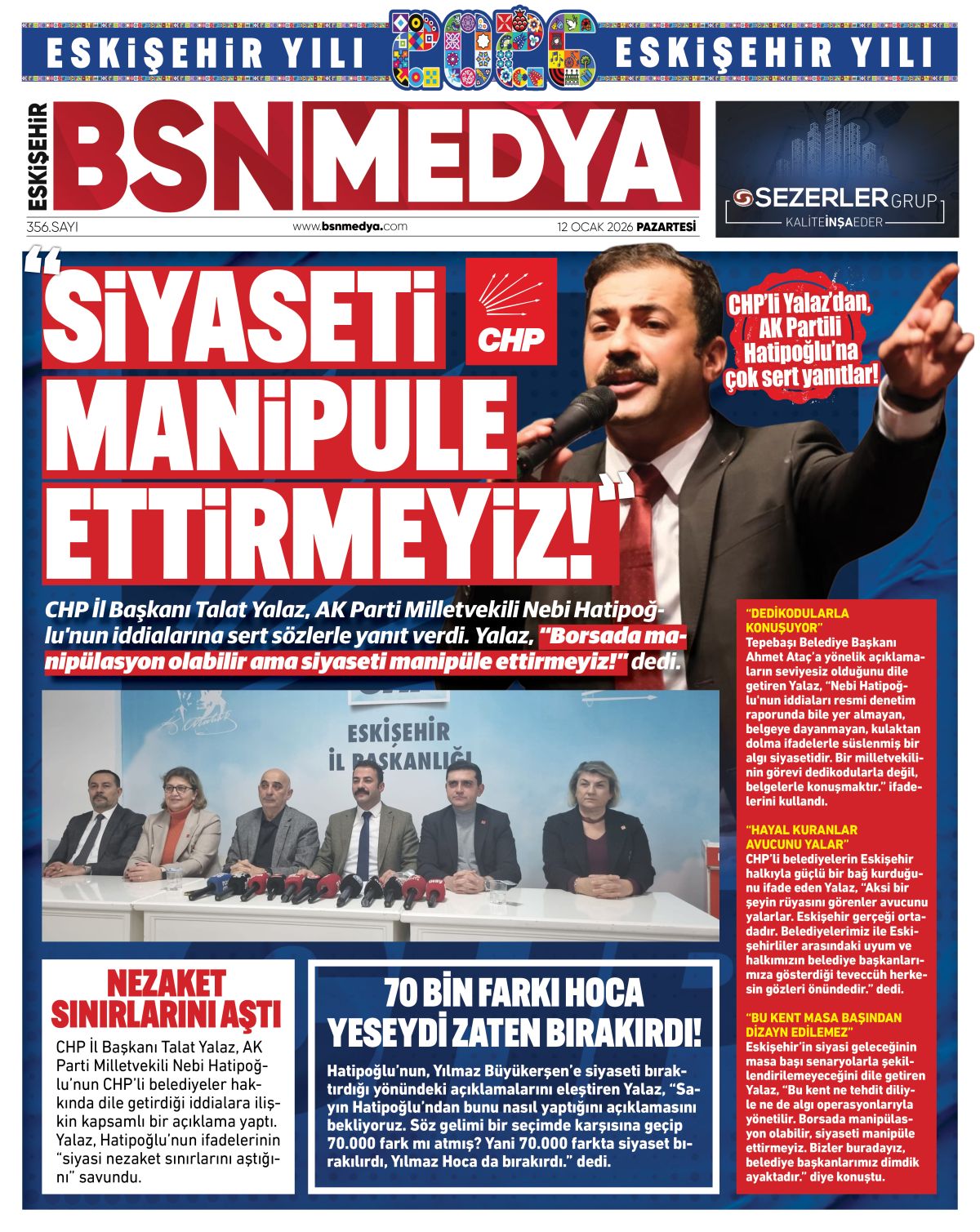 Eskişehir’in siyasi geleceğinin masa başı senaryolarla şekillendirilemeyeceğini dile getiren Yalaz, “Bu kent ne tehdit diliyle ne de algı operasyonlarıyla yönetilir. Borsada manipülasyon olabilir, siyaseti manipüle ettirmeyiz. Bizler buradayız, belediye başkanlarımız dimdik ayaktadır.” diye konuştu.